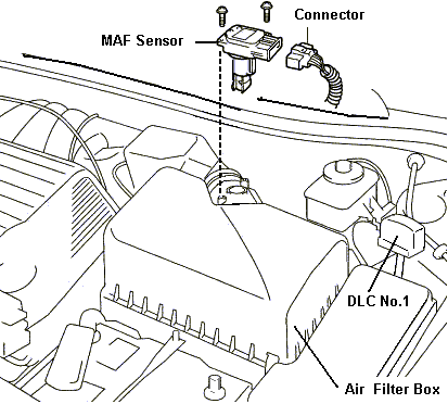 The MAF sensor is located directly in the intake air stream, between the air cleaner and throttle body.